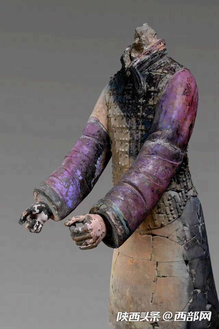 新的发掘证实,每一件陶俑的头发颜色、肤色和服饰颜色不完全相同。头发颜色有的漆黑,有的棕褐;脸、手、足等暴露部分的肤色,或粉红,或肉红,或骨白,甚至眼仁虹膜部分,不同个体也有差异,暗红、漆黑,淡棕等诸多变化。其中有一件陶俑的下眼睑还用细笔描绘出根根睫毛。服装残留的颜色多数已经脱落在淤土上,有红、绿、蓝、紫、青等,经过色块对比,俑坑中已发现17种不同的色彩,尤其是紫色、蓝色非常珍贵。