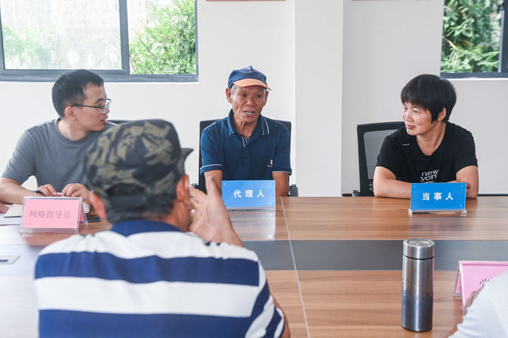 2023年7月26日,在浙江省诸暨市东白湖镇娄东村新时代文明实践站的文明共富会客厅内,网格长召集村里矛盾双方当事人以及党员代表、乡贤代表、人大代表等成员进行宅基地指标纠纷的现场调解。新华社记者 徐昱 摄