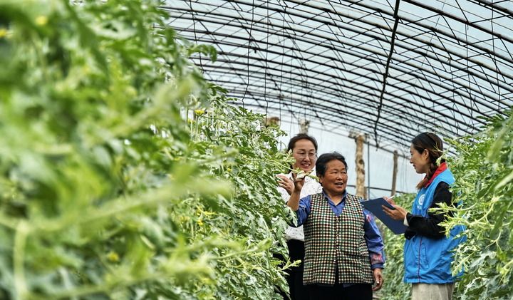 2024年4月9日,北京市大兴区庞各庄镇李家巷村政务服务站的工作人员来到大棚内为瓜农办理社保业务。新华社记者 李欣 摄