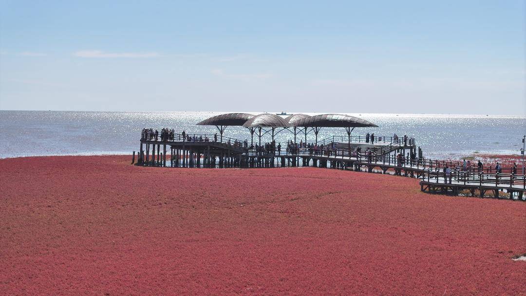 在辽河入海口,盘锦红海滩以“全球唯一由碱蓬草织就的红地毯”惊艳世界。这片红色秘境,是气象与地理交织的自然馈赠,它的“红”更是气象与盐碱地共同谱写的生命乐章。