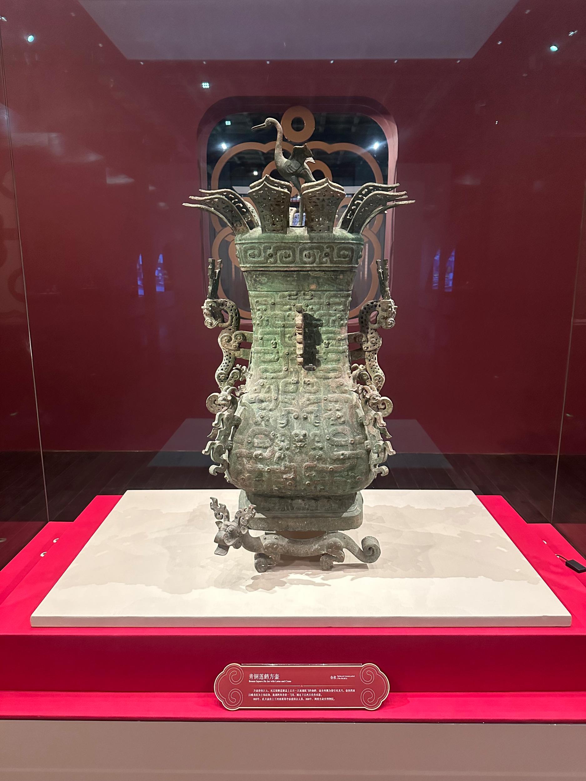 △故宫展出的青铜莲鹤方壶。(总台央视记者朱超拍摄)