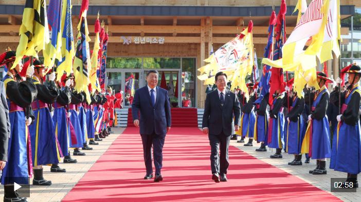 在庆州博物馆的千年微笑馆,李在明总统为习主席举行高规格欢迎仪式,身着传统民族服饰的韩国礼仪队,隆重欢迎习主席到来。