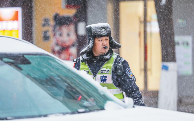 丹东市锦山大街与六纬路路口,交警冒雪指挥交通。 本报特约记者 周广庆 摄