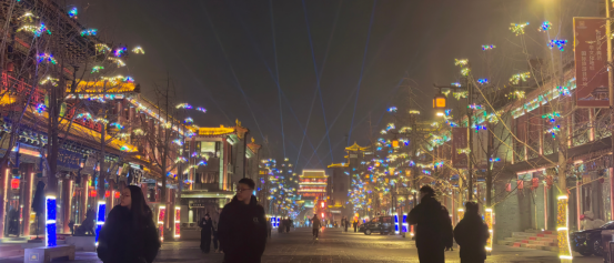 鳞次栉比的商铺装饰一新,门前挂满红灯笼,玻璃橱窗上贴着剪纸窗花,各色年货琳琅满目。熙熙攘攘的人潮涌动,人们纷纷前来购物娱乐,游览打卡,洋溢着轻松愉悦的笑容。
