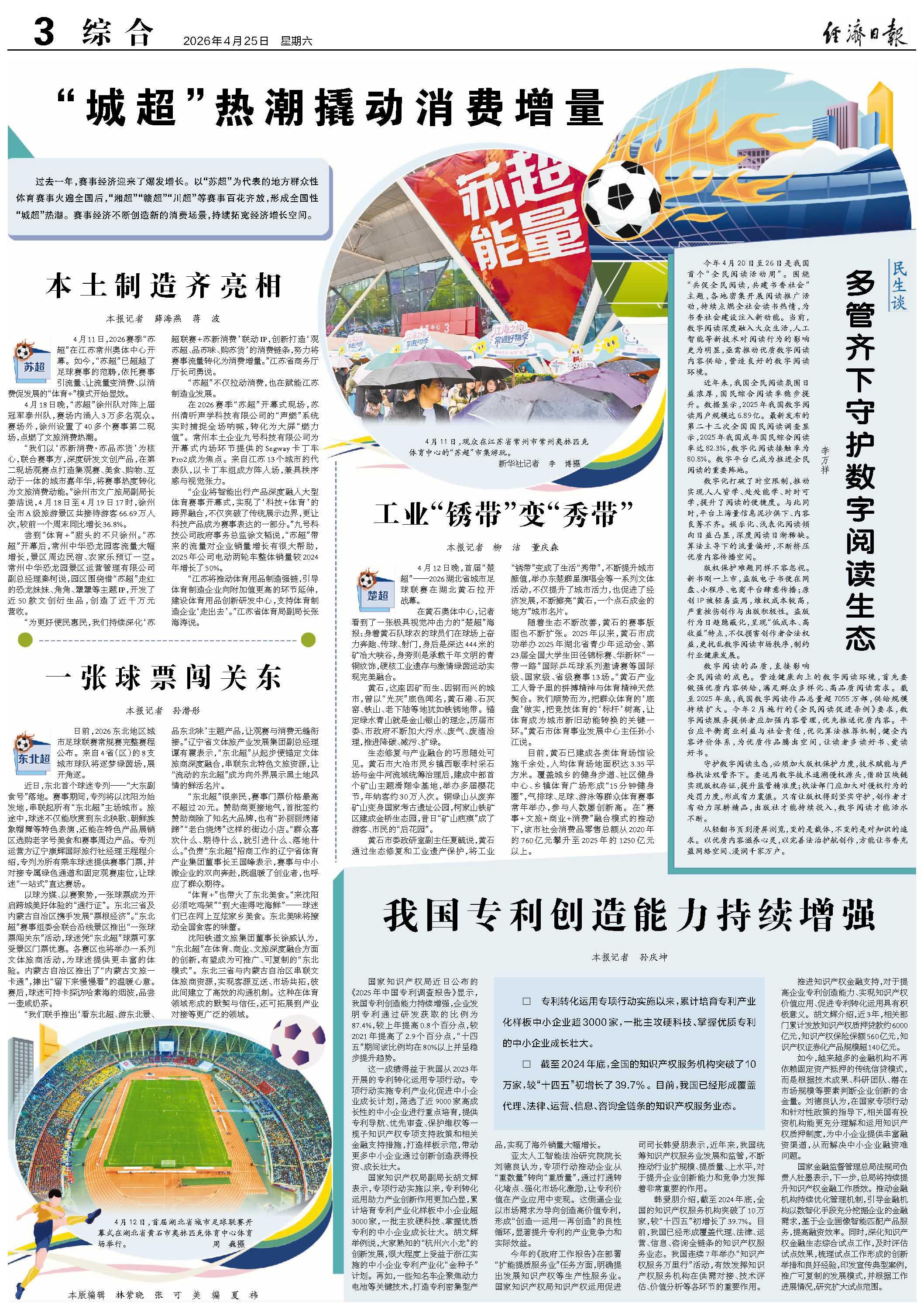 过去一年,赛事经济迎来了爆发增长。以“苏超”为代表的地方群众性体育赛事火遍全国后,“湘超”“赣超”“川超”等赛事百花齐放,形成全国性“城超”热潮。赛事经济不断创造新的消费场景,持续拓宽经济增长空间。