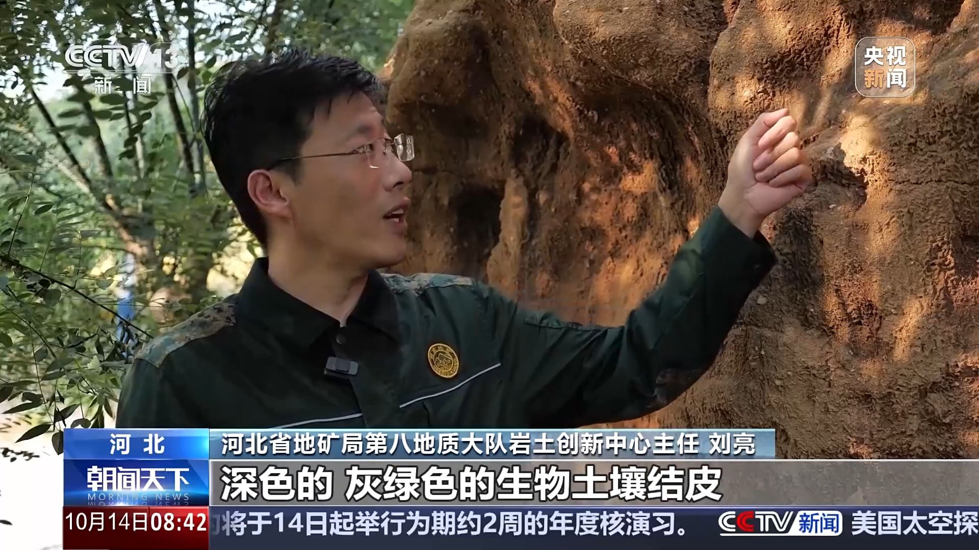 河北省地矿局第八地质大队岩土创新中心主任 刘亮:这里就是夯土长城的实体,这种深色的、灰绿色的生物土壤结皮能够有效防止雨水的侵蚀。这种丝状蓝藻可以和土壤形成有效的包裹缠绕。同时丝状蓝藻可以分泌多糖,可以有效胶结土颗粒,形成的空间网状结构可以很好保护夯土长城。