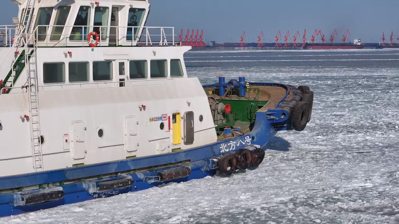 寒风凛冽,营口港的港池早已被一大片海冰覆盖。站在港口望去,多艘大马力拖轮正在冰面上破冰前行,为往来货船开辟出一条航道。
