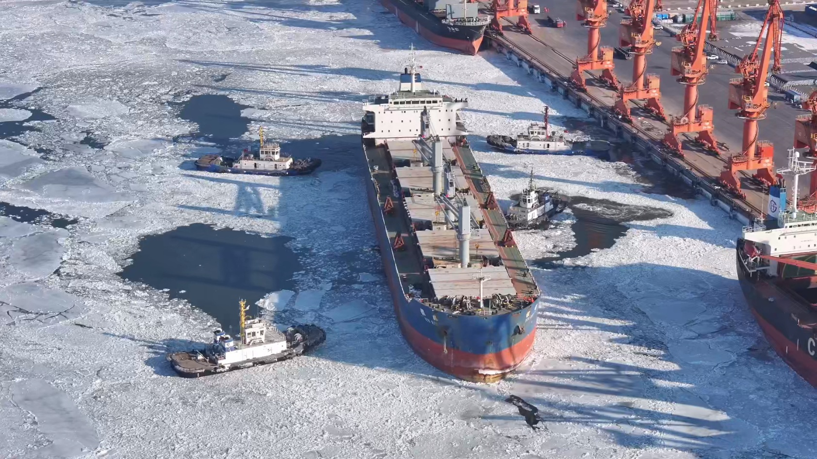 随着港口里的海冰被大马力拖轮奋力推开,排成一队的货轮在海事执法船的护航下缓缓驶离营口港。等到它们返航回港时,或许这里已经迎来了冰雪消融、万物复苏的春天。