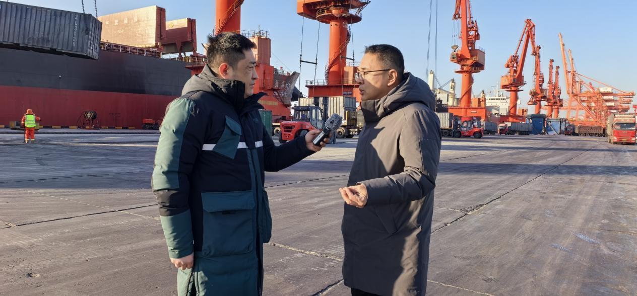 总台记者采访辽港控股(营口)有限公司生产部副部长柳伟杰(右)