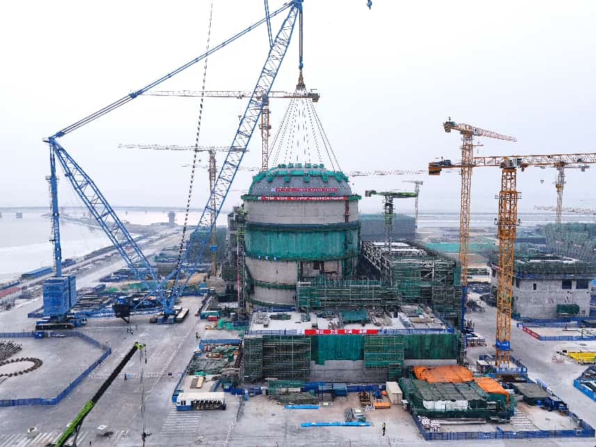 2月10日上午9点37分,1号机组核岛钢制安全壳顶封头吊装就位。中核辽宁核电有限公司供图