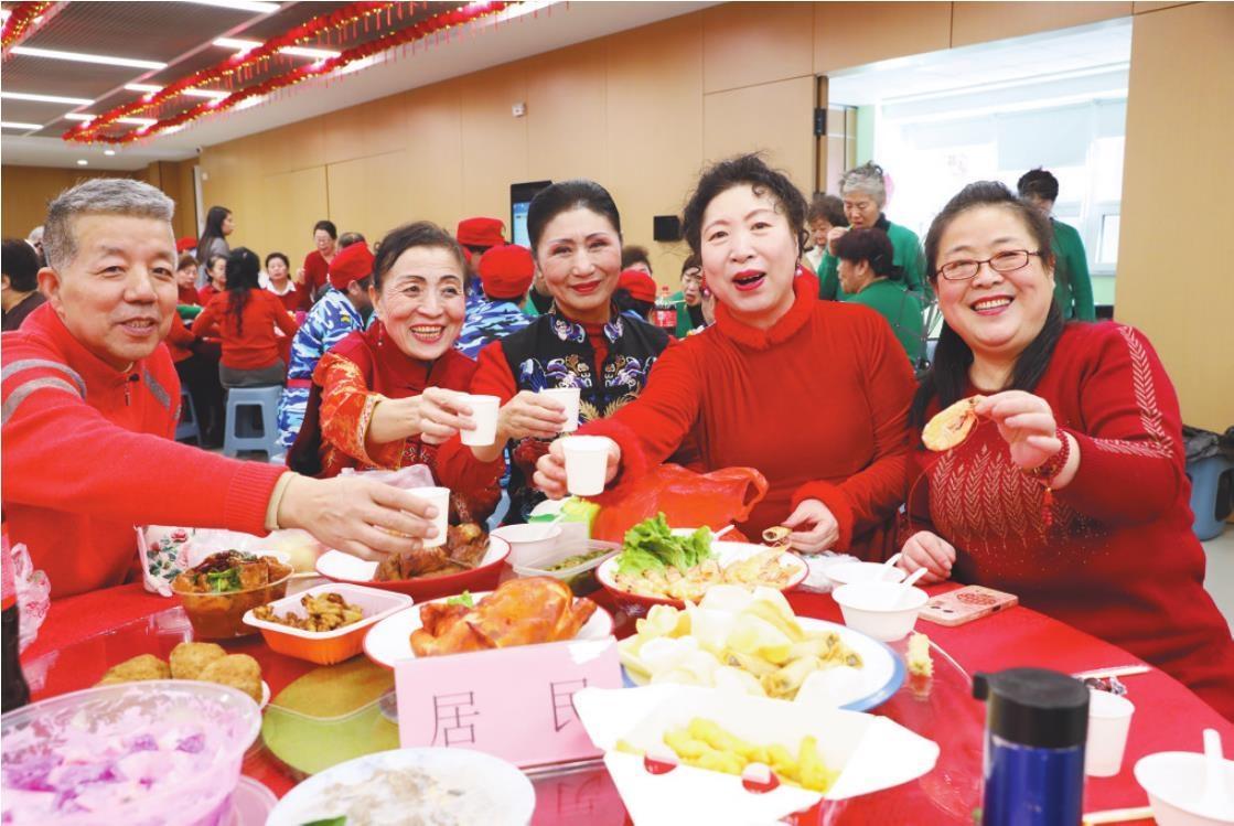 上午9点,逯军端着热气腾腾的菜肴走出家门,前往百家宴现场。社区里张灯结彩,红灯笼随风摇曳,居民们剪的窗花、编的中国结将楼道装点得喜气洋洋。逯军看着刷成暖红色的居民楼对记者说:“这两年外墙加了保温层,现在冬天屋里能暖和好几度。”